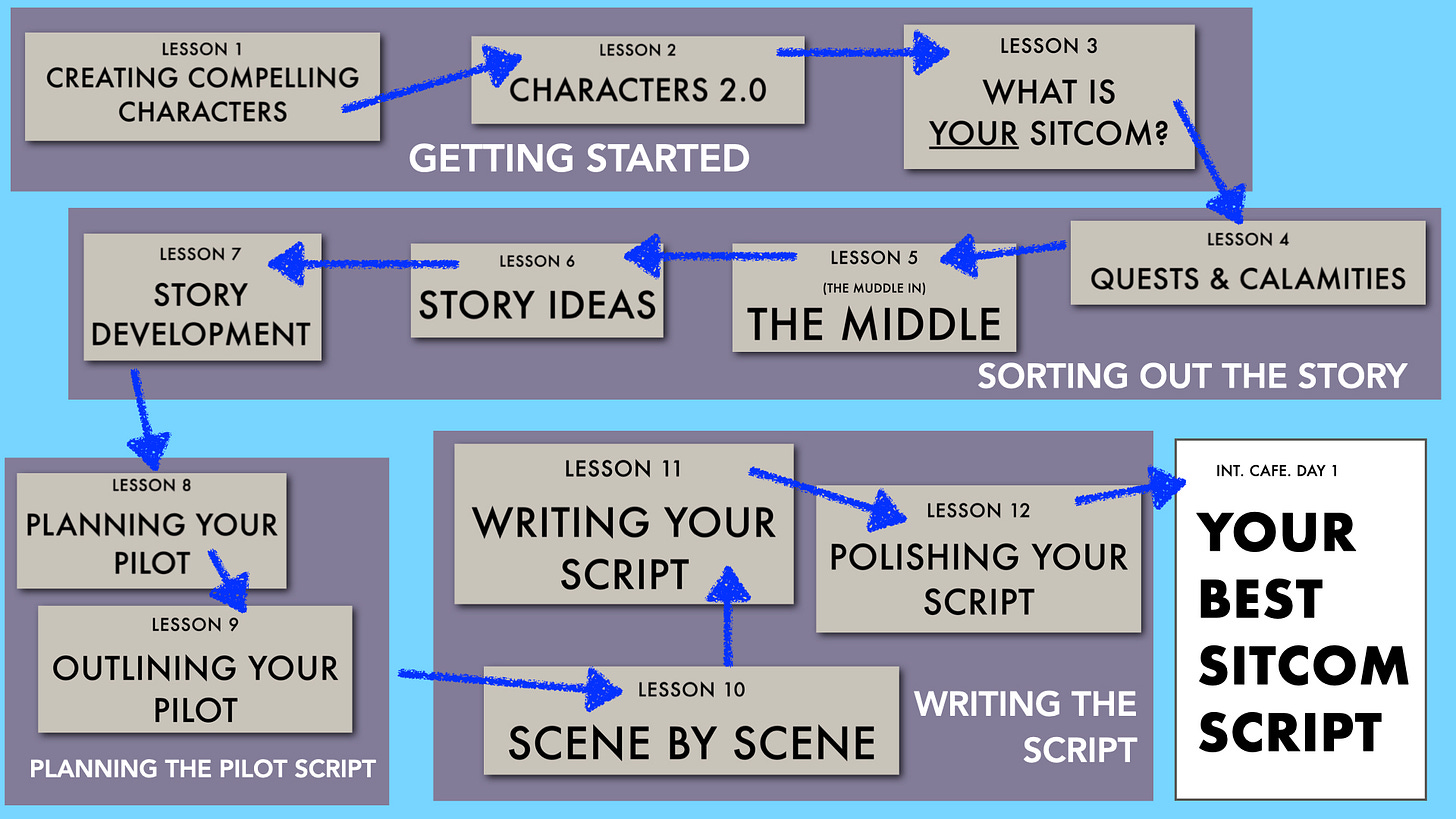 You could go right back to basics and allow me to walk you through the whole process of writing a sitcom in this course. The idea is to help you produce a script that you’re actually proud of. Now there’s a nice clear goal…