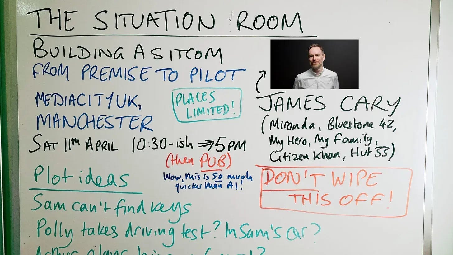 That’s why I urge you to go out of your way to come to the Situation Room workshop Building a Sitcom: From Premise to Pilot at MediaCityUK in Manchester on 11th April 26. We’ll be plotting stories, breaking them down, turning them into a pilot episode and learning from each other. You’ll never learn to read the room if you’re never in the room. That’s why you need to get in the room.